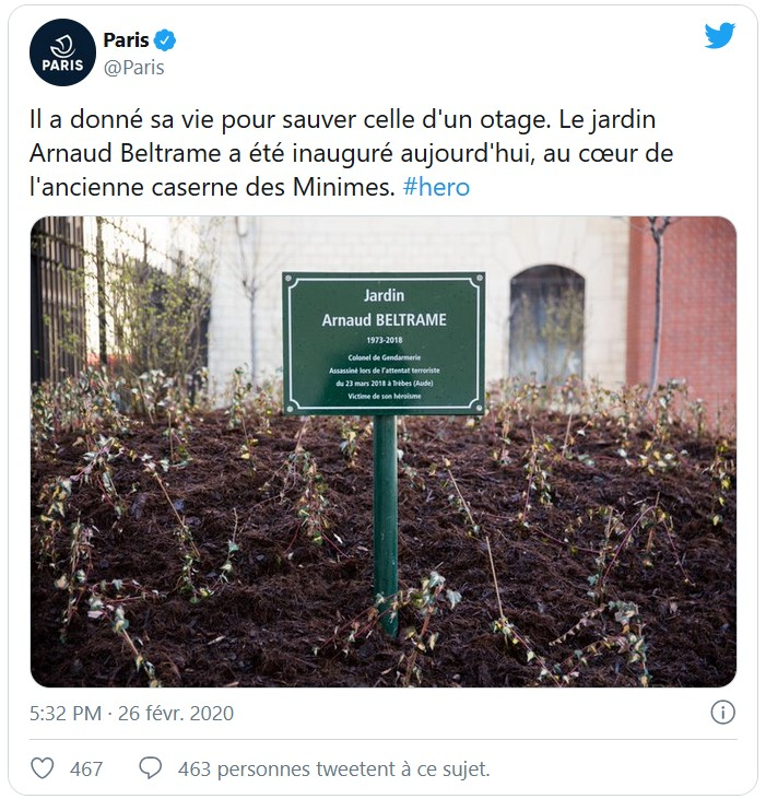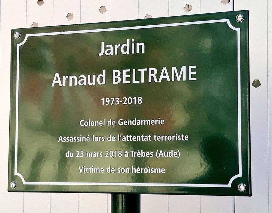 Le 26 févier 2020, Anne Hidalgo, maire de Paris, inaugurait quant à elle un jardin en hommage au lieutenant-colonel Beltrame. La plaque verte mentionne ceci : « assassiné lors de l’attentat terroriste du 23 mars 2018 à Trèbes (Aude), victime de son héroïsme ».